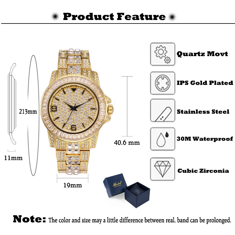MISSFOX Arabic Numerals Men's Watch Diamond Luxury Gold Watch Men Rolexable Stainless steel Iced Ou